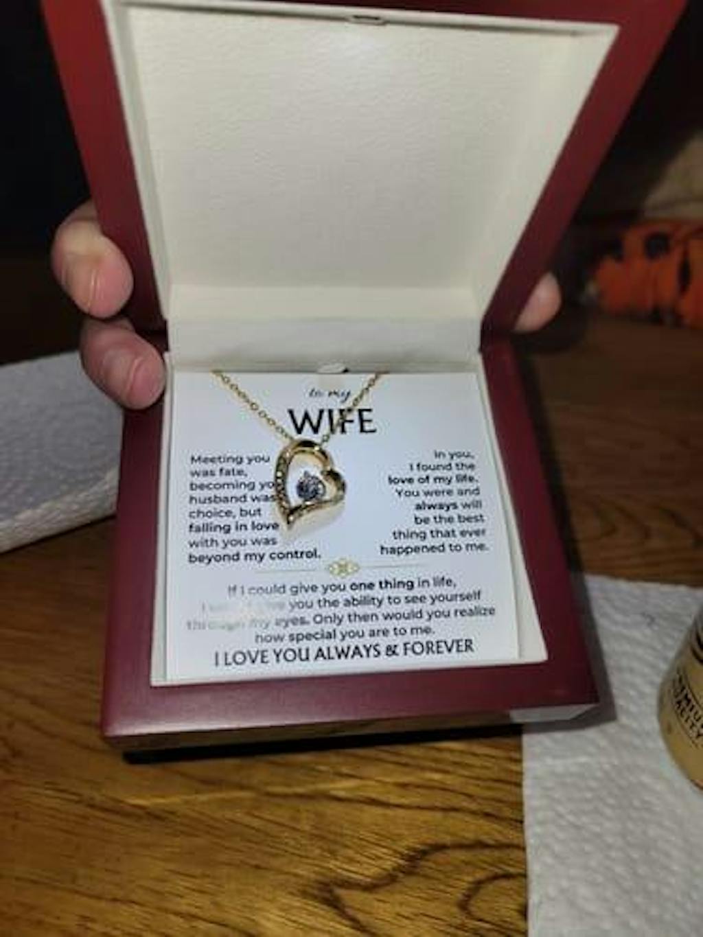 Two-toned box or Mahogany style box with built-in led spotlight that lights upon the necklace and the message card, making it more special.